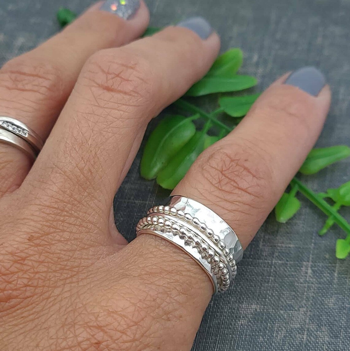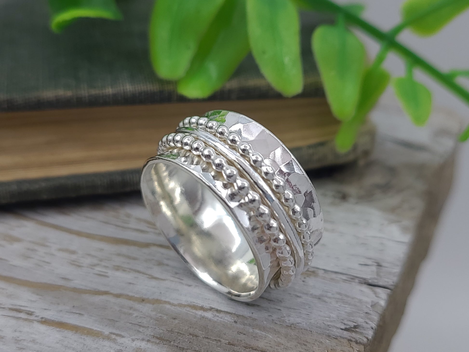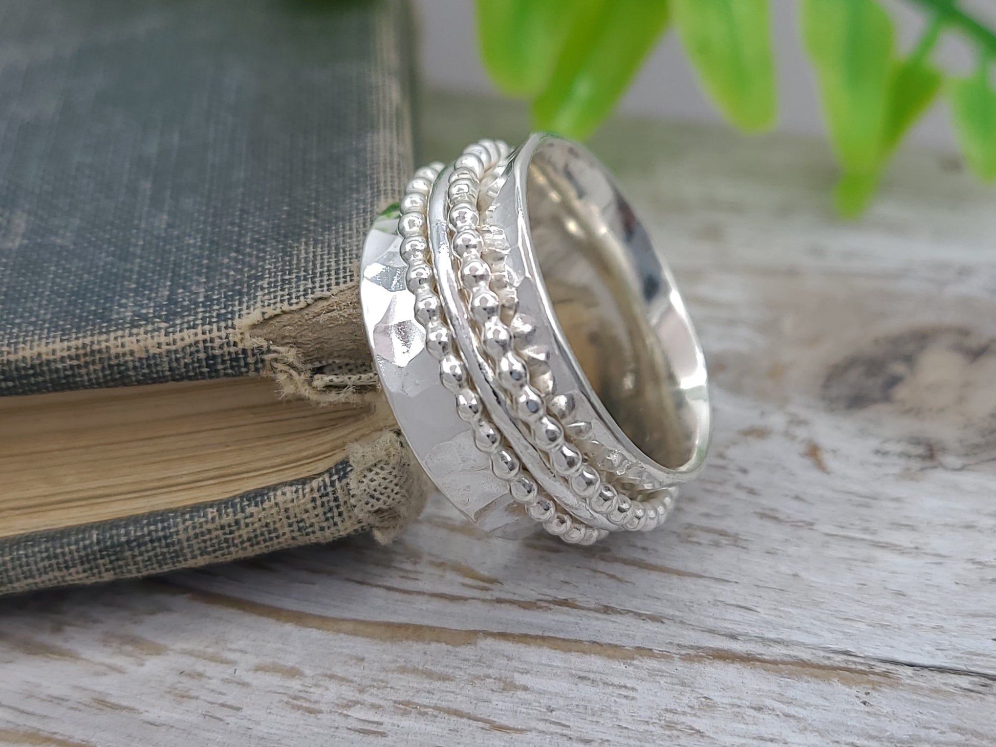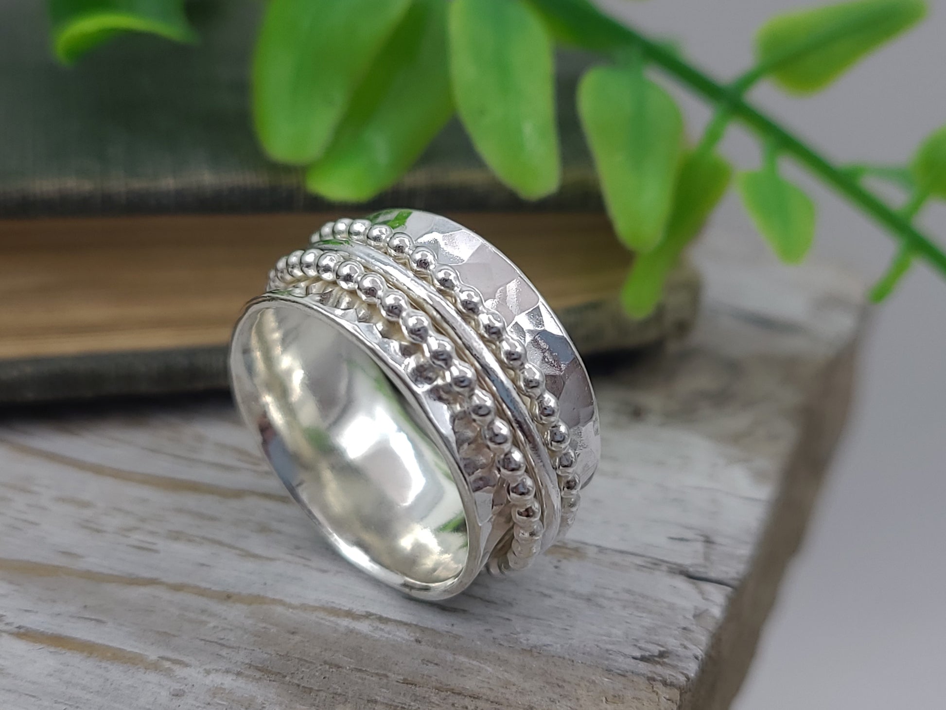 Spinner rings are gorgeous and fun! I hand cut these stunning rings from sterling sheet metal and then forged, shaped, textured and polished. I place three individual rings around the wider band...two beaded sterling bands and one smooth band in the middle. I roll the edges of the ring slightly to hold the smaller bands in place and by doing this, it makes a wonderfully smooth gliding ring when slide on your finger. The fit is so comfortable!!