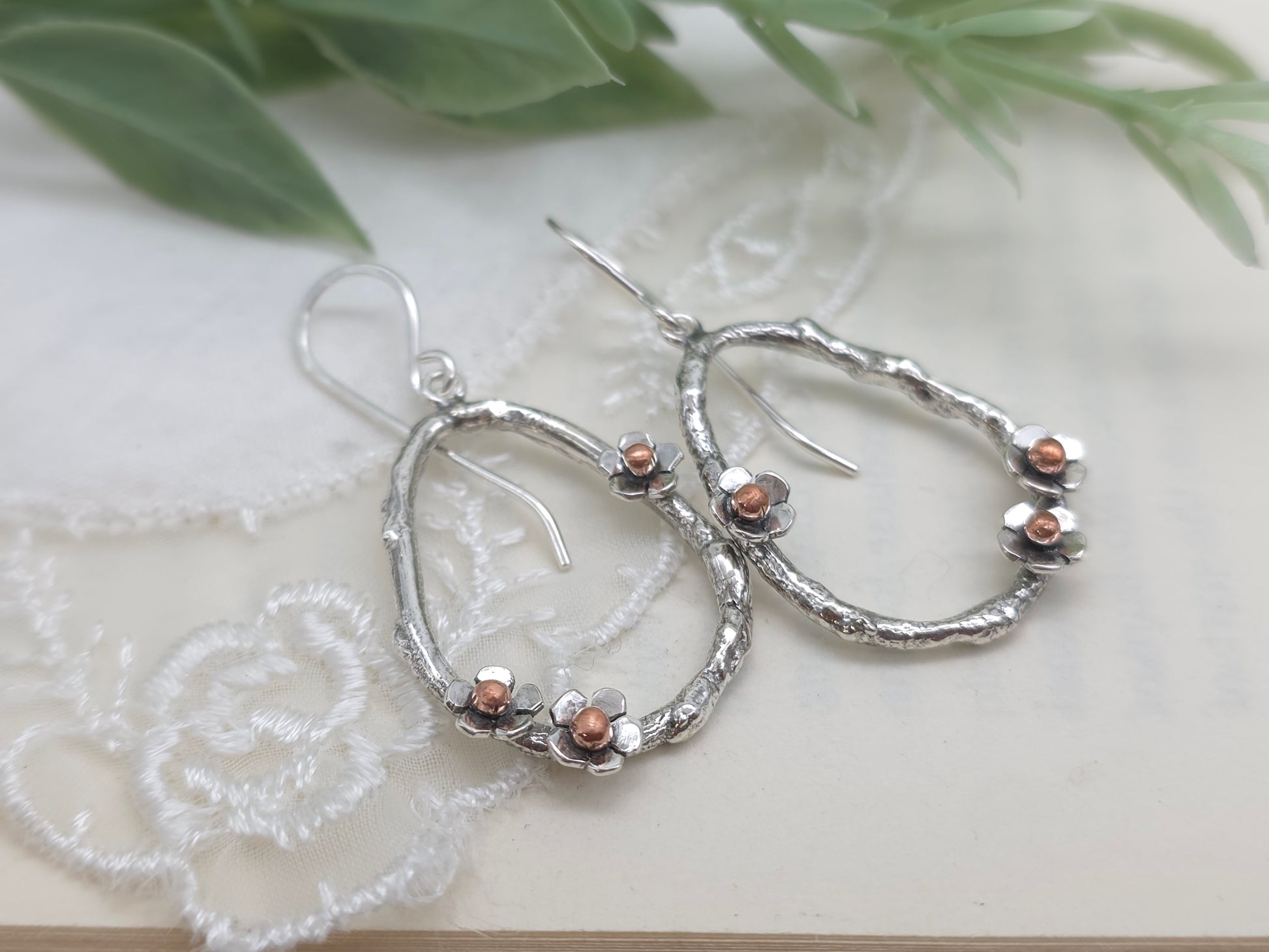 Inspired by the quiet beauty of the nature, these earrings feature a hand-forged sterling silver twig detailed frame accented with hand-formed sterling silver flowers with warm copper centers. The mix of metals creates an amazing contrast, while the organic design makes each piece truly one-of-a-kind.