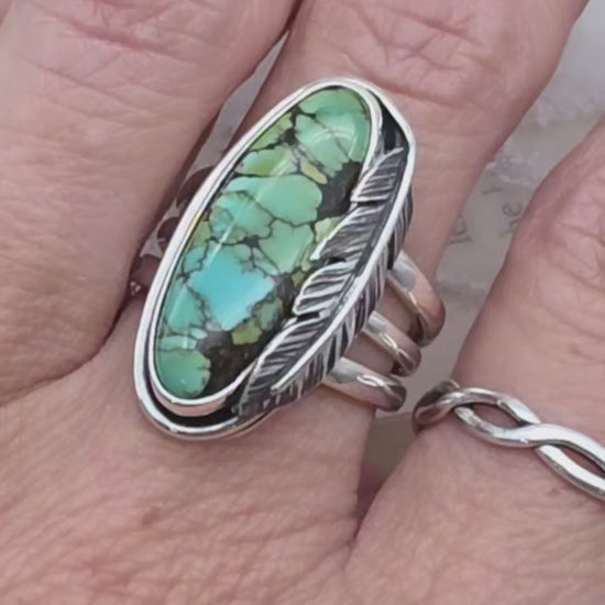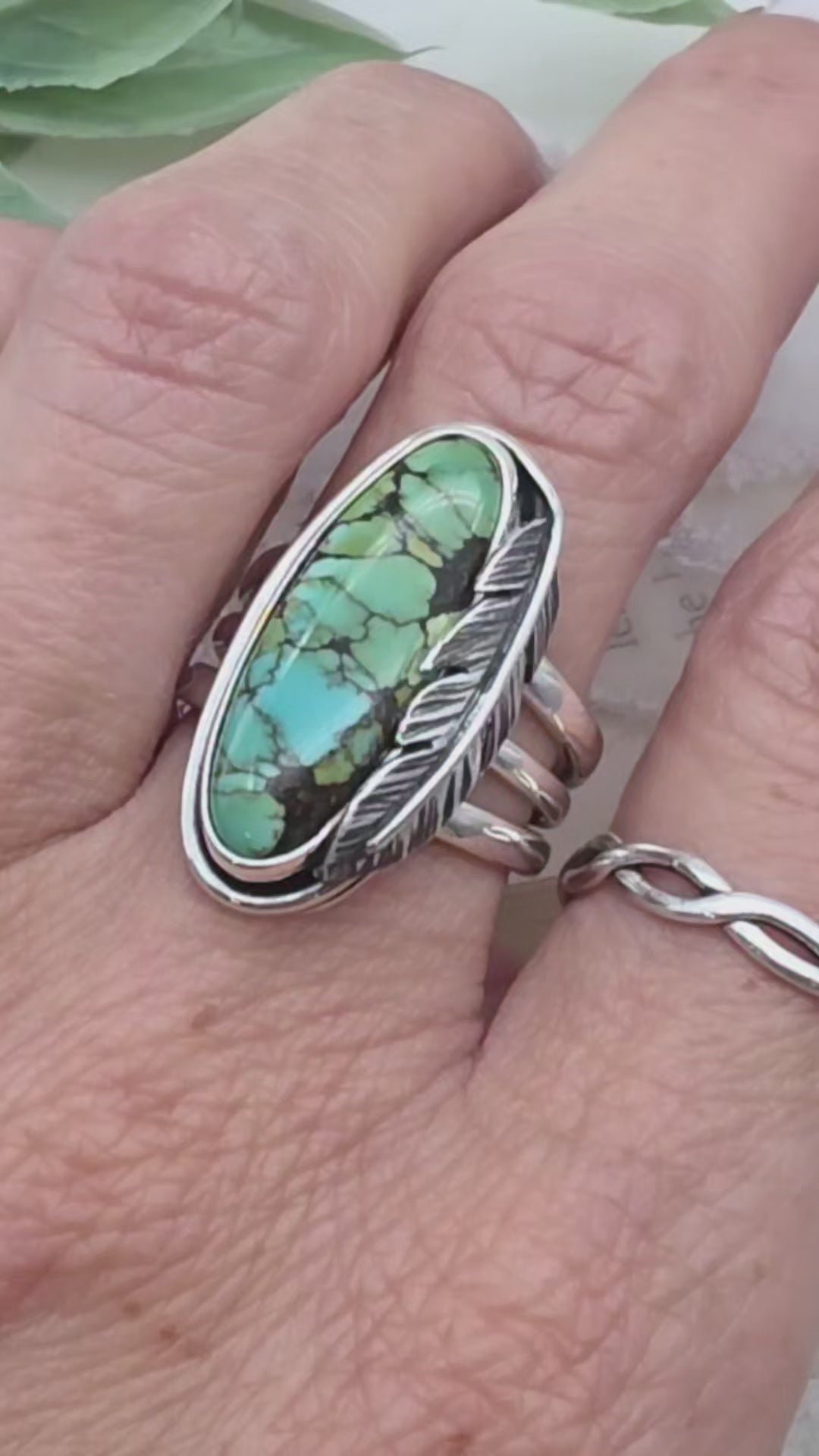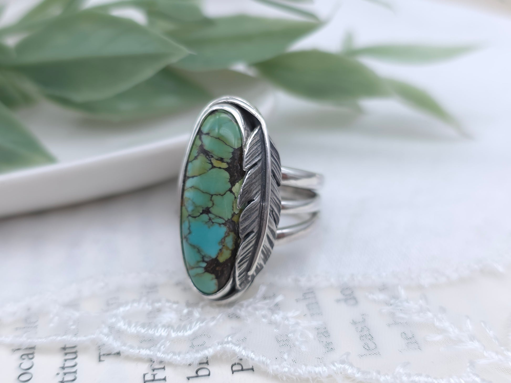 This breathtaking ring displays a gorgeous genuine turquoise gemstones encased in an eye-catching hand forged sterling setting. Featuring a stunning feather that wraps perfectly around the edge of the stone. All set upon a gorgeous solid sterling silver triple band ring.