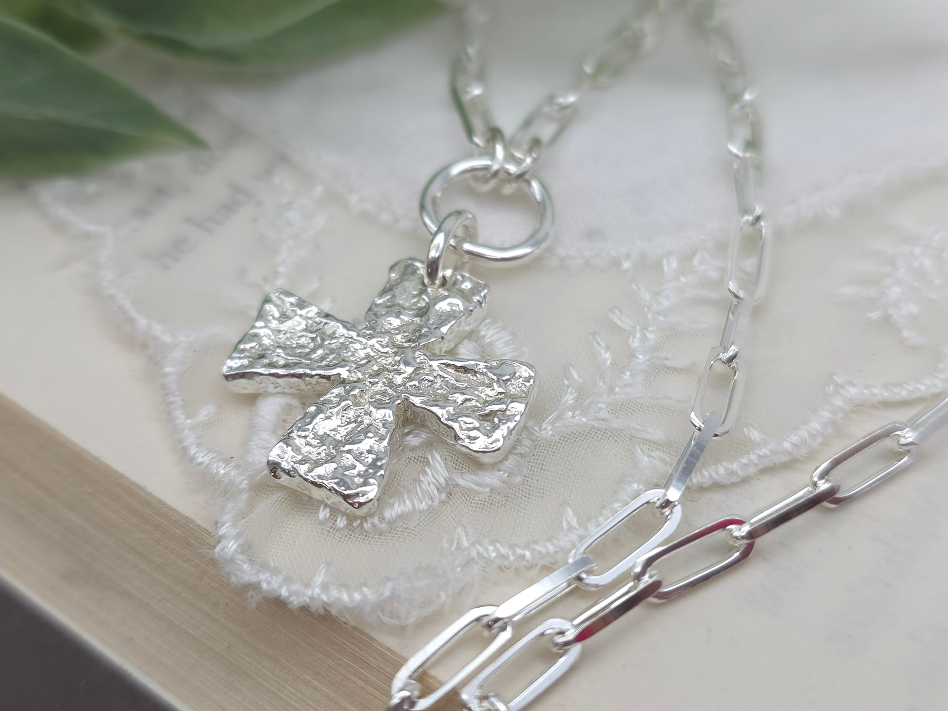 Hand forged from solid sterling silver; I start by melting and rolling a thick sheet of sterling silver. Then cut, shape and texture this amazing pendant. Hanging from a chucky solid sterling silver paperclip chain. This is a piece you won't want to take off! Wear it solo for a simple but stunning look or layer it up for a modern curated style. Trust me ... either way... you won't be dissatisfied!!