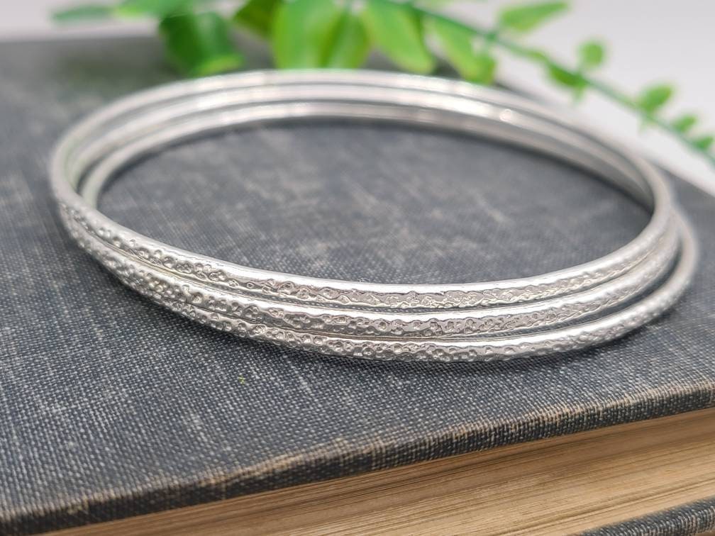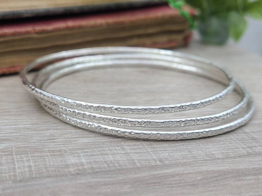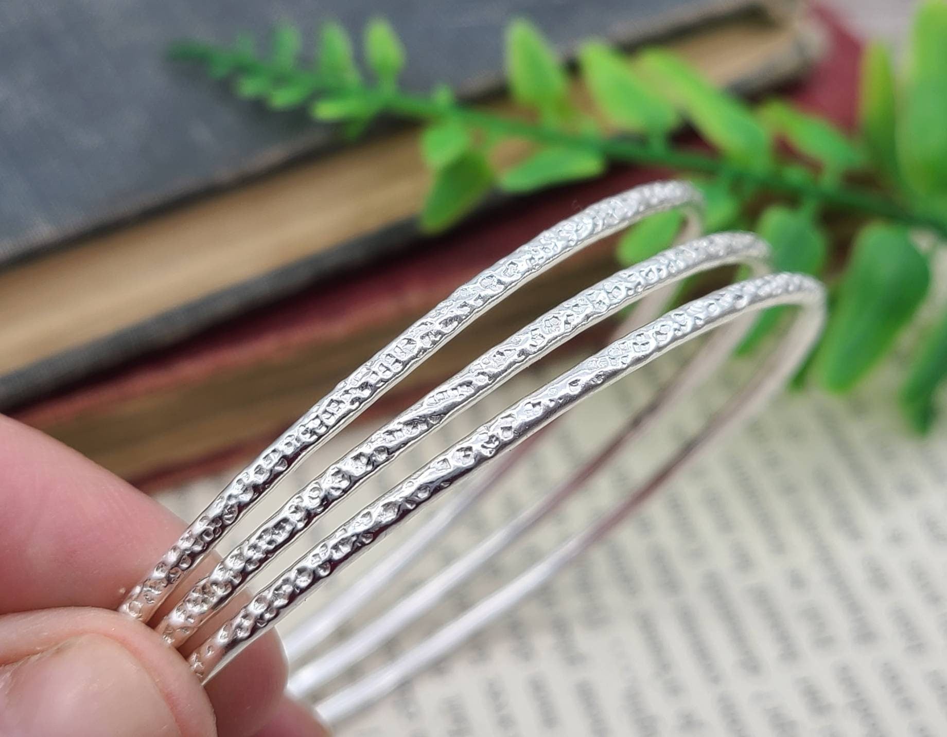 Love these dainty sterling bangle ... throw them on for a fun boho gypsy feel! I hand forge these delicate bracelets using solid fine sterling silver wire. Shape and then hammer giving them a gorgeous pave` appearance. Machined polished to a gorgeous shine!!